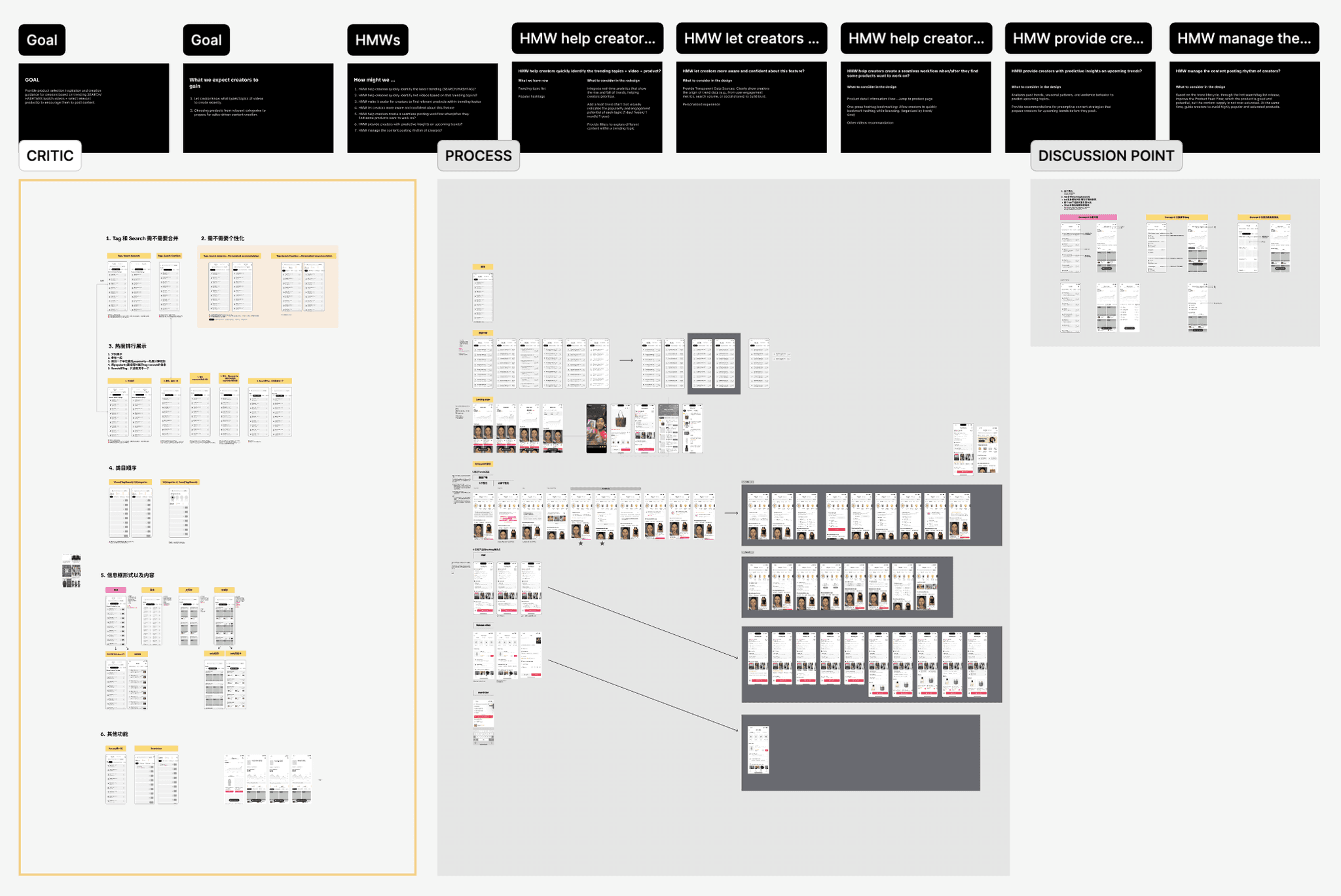 To better address the creators’ pain points, I revisited the existing trend discovery and product selection process, analyzing where it slows creators down and causes inefficiency. After several rounds of research and brainstorming, we identified key opportunities to unify scattered trend signals, surface high quality videos, and simplify the path from trends to relevant products.